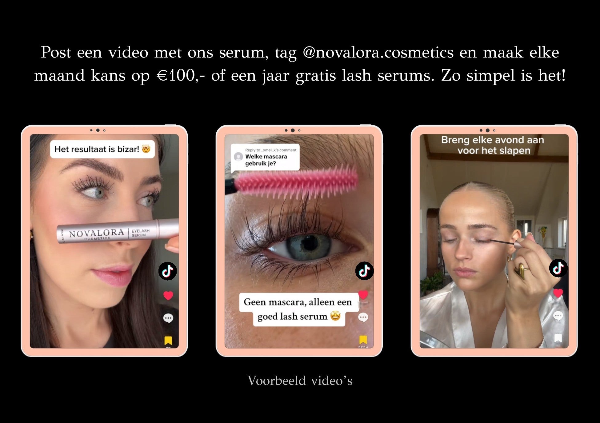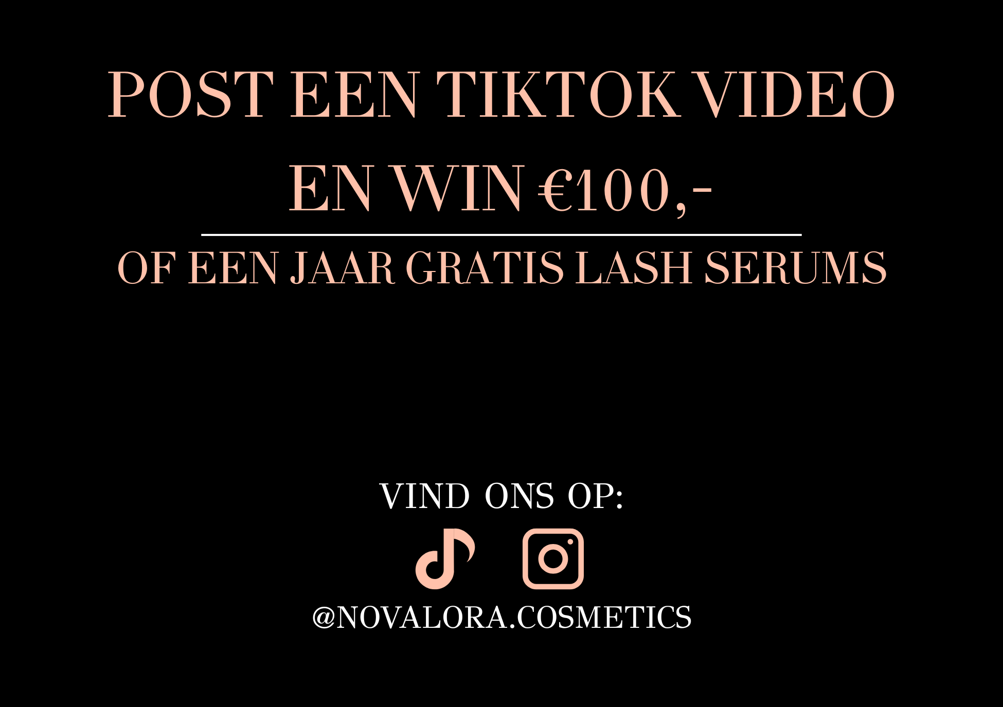 Deelname: Deze giveaway staat open voor iedereen die een video plaatst waarin onze producten te zien zijn op Instagram of TikTok en @novalora.cosmetics tagt.